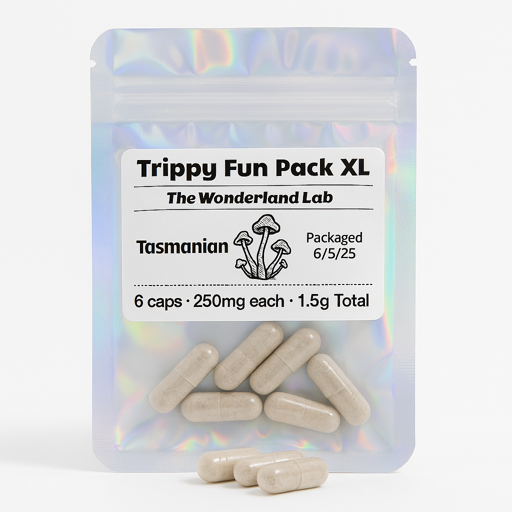 Tap into the wild clarity of the Southern Hemisphere with our Trippy Fun Pack XL – Tasmanian edition. Infused with 1.5 grams of premium Tasmanian Psilocybe cubensis, this microdose pack features 6 capsules at 250mg each — perfectly portioned for mindful mood elevation, mental clarity, and creative flow.